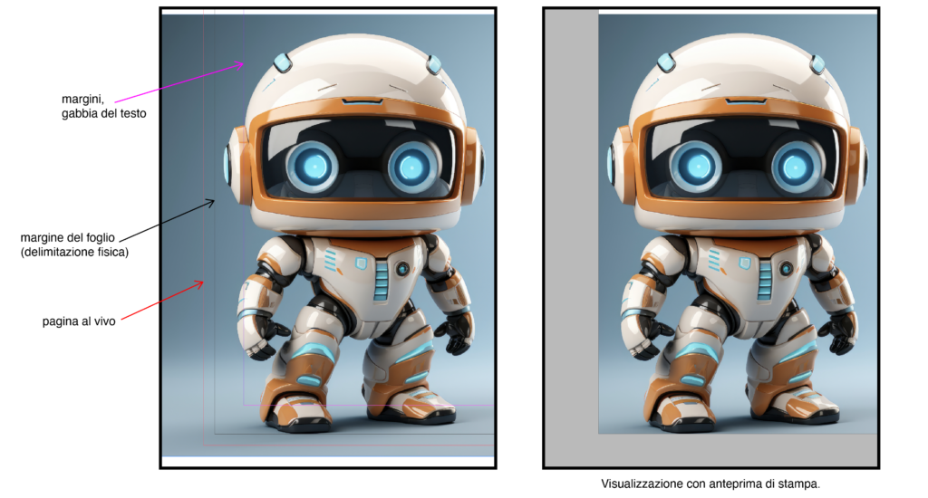 I margini sono (impropriamente) i limiti dell’elaborato. Quando si imposta un lavoro è fondamentale settare e considerare anche le pagine al vivo che sono rappresentate da degli “sbordi” di qualche millimetro fuori dal foglio di lavoro (oltre i margini quindi). Le pagine al vivo sono l’errore di taglio della macchina, per questo è consigliabile tenerle in considerazione e se ci sono elementi grafici posizionati sui margini riempire bene le pagine al vivo così da camuffare gli errori di taglio nel caso ce ne fossero.