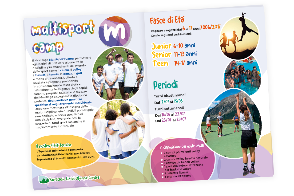 Brevemente… Questa brochure è multicolore ed energica come i campi estivi per ragazzi che illustra.